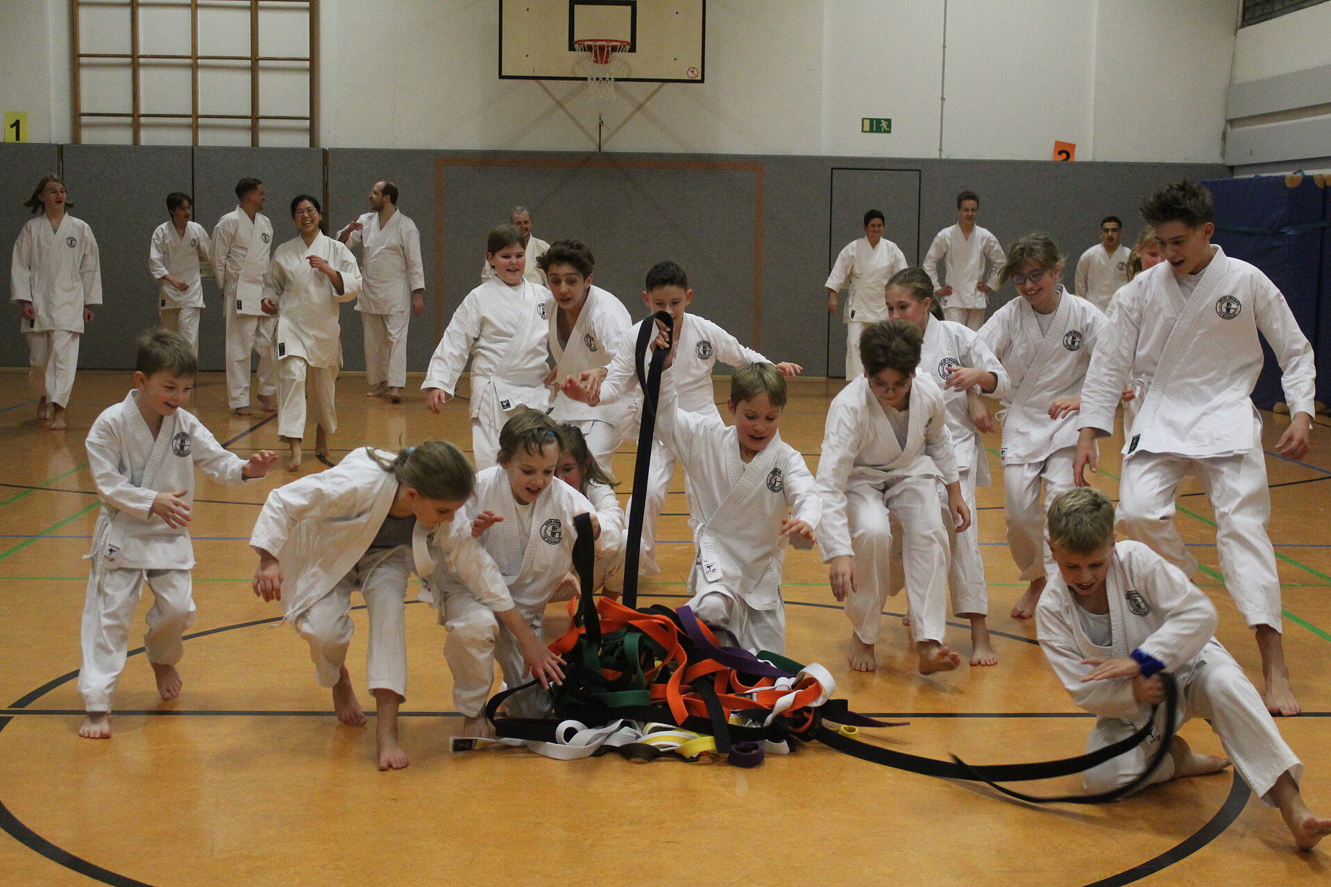 Zu Beginn durfte natürlich der Gürteltausch nicht fehlen, bei dem alle Gürtel in einem großen Haufen gemischt werden, auf den sich danach alle mit vollem Elan stürzen können, um die "besten" Gürtel zu ergattern. Danach gab es natürlich noch Klassiker wie: Kata laufen - Huckepack, Mattenrutschen und das große Gürtelfangen.