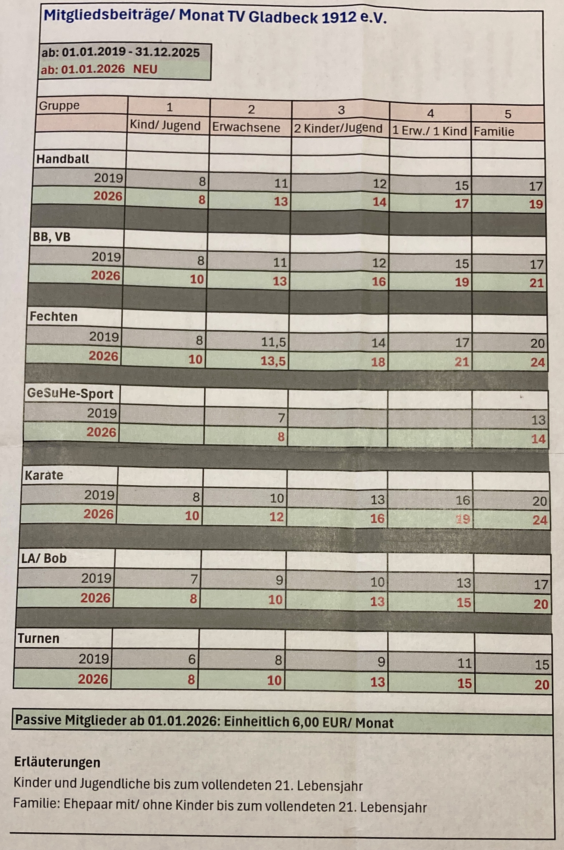 Die letzten Erhöhungen wurden 2019 beschlossen. Bei der JHV des TV Gladbeck segneten die anwesenden Mitglieder den vom Vorstand ausgearbeiteten Entwurf ab. Gültig wird er ab Januar 2026.