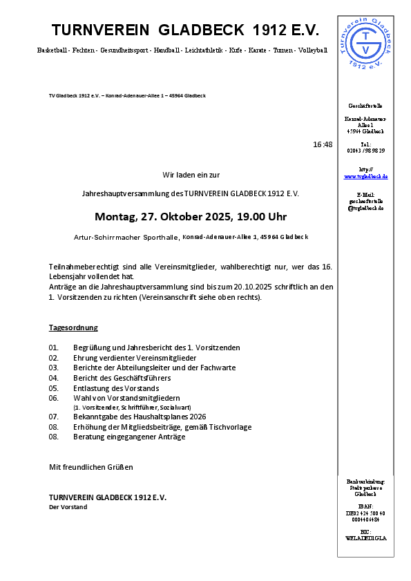 Alle Vereinsmitglieder des TV Gladbeck sind eingeladen, an der Jahreshauptversammlung des Vereins am Montag, 27. Oktober, um 19 Uhr teilzunehmen. Wie inzwischen gewohnt, findet das jährliche Treffen in der Artur Schirrmacher Sporthalle am Heisenberg-Gymnasium in Gladbeck statt. Wahlberechtigt sind alle Mitglieder ab 16 Jahren.